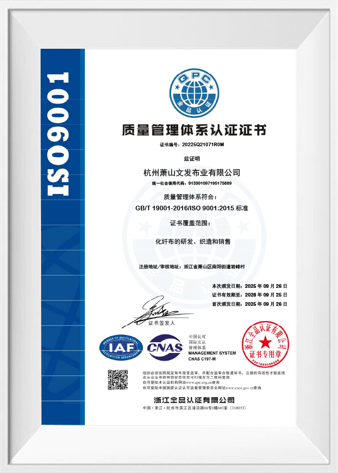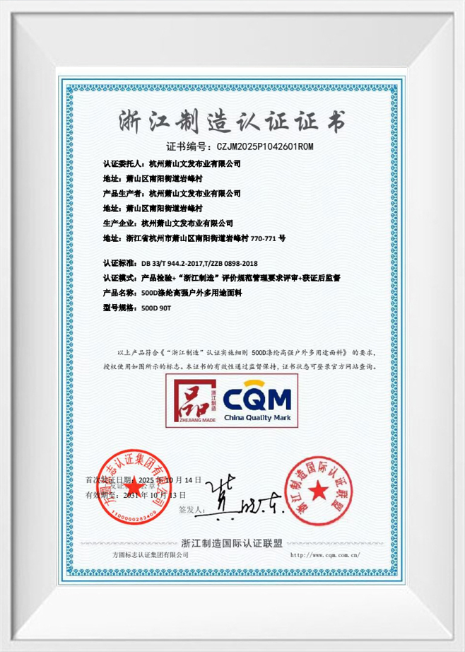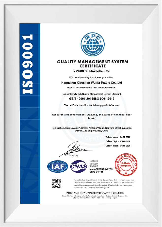 Wenfa Textile bersertifikat ISO dan memenuhi standar global seperti REACH, GRS, dan OBP, memastikan bahwa kain mereka memenuhi persyaratan kualitas dan keberlanjutan yang ketat. Komitmen mereka terhadap kualitas dan inovasi menjadikan mereka pilihan utama untuk bisnis di berbagai sektor, termasuk koper, perlengkapan luar ruangan, dan produk anak-anak.